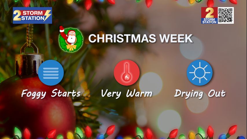 Christmas Eve & Day: Christmas Day will almost be a carbon copy of Christmas Eve from a weather standpoint. Mornings will start off mild in the mid-50s with areas of dense fog developing. Santa might have to put Rudolph to good use while delivering presents. Expect fog to gradually burn off throughout the morning, revealing sunshine. Afternoons will be warm with temperatures topping out in the upper 70s.