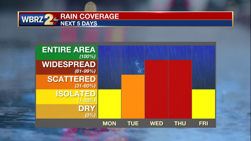 Up Next: Tuesday temperatures will peak in the low-90s and more showers and storms will be possible. Rain will mainly be in the afternoon hours and most people will see a shower. Over the next several days the rain chances increase. Wednesday and Thursday are shaping up to be total washout days with widespread showers for several hours throughout the day. These showers will keep our temperatures just below average in the high-80s across the area. Later in the week the rainy pattern begins to ease up, but we are still forecasting isolated showers. Be sure you keep your umbrella in your car this week, you will need it.