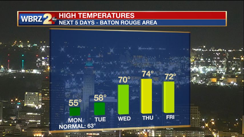 Up Next: On Monday night temperatures will be flirting with freezing. Baton Rouge is expected to bottom out near 34°. Then, the warmup really kicks in. Mostly sunny skies and temperatures in the upper 50s expected for Tuesday with overnight lows in the 40s. Wednesday afternoon high temperatures will be in the low 70s and overnight lows will be much warmer, in the upper 50s. Temperatures will trend in the 70s through the rest of the 7-day forecast. The warm pattern will bring with it the next chance for rain. Showers and storms will be possible starting Friday morning and lasting into Saturday morning. Right now, it looks like most of the shower activity will clear out before the evening hours on New Year’s Eve. The timing of rain can still shift, so stay connected and we will keep you ahead of the storms. Click here to see the 7-day forecast.