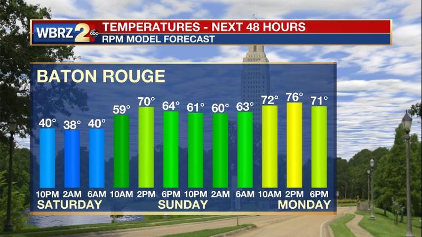 More showers will be in the forecast for Tuesday on the order of 50% and these will likely arrive along and ahead of the cold front located to the northwest and will be pushing it's way into south Louisiana in the late evening and overnight hours on Tuesday. Showers will begin to dissipate on Tuesday morning as the cold front approaches and pushes the rain eastward. We will be left with cloudy conditions for much of the day and could possibly expeience a clearing before sunset. Stay tuned to WBRZ for the latest weather updates.