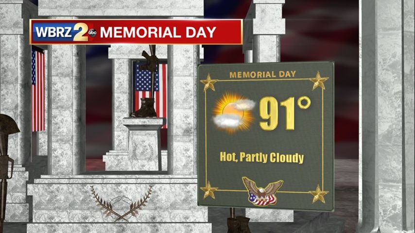Today and Tonight: Partly cloudy skies for your Memorial Day, as warm and humid conditions continue. Highs will peak near 91° with southerly winds between 5 and 10 mph. Heat index values will top out near 97°, as the UV Index will be in the extreme category. This is the highest the scale goes, so make sure to keep the sunscreen close and stay hydrated if you are spending any time outdoors. More cloud cover tonight will allow temperatures to slowly drop to a low near 71°.