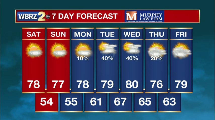 Up Next: Sunday will have the coolest morning within the 7-Day Forecast as lows settle in the low to mid 50s. Another nice afternoon is expected as highs return to the mid 70s. Though a lot of sunshine will be around early, some clouds will start to mix in through the day. Monday will be partly sunny with an outside shot at a shower. An unsettled weather pattern is coming together for the middle of next week. Though no washouts are foreseen now, scattered showers and thunderstorms are on the board Tuesday through Thursday. With extra clouds and times of rain, high temperatures will be a touch below average in the upper 70s and lows will be above average in the 60.