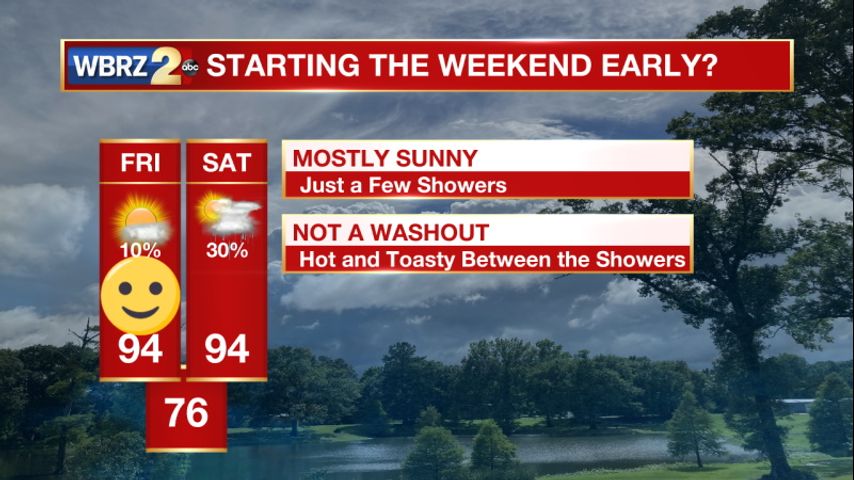Up Next: Rain will make an appearance for some on Friday. You will be able to count the number of isolated showers on your fingers. Temperatures staying near 94 through the weekend. The weekend will be mostly sunny, but your best chance to see some afternoon showers will be on Saturday. Temperatures will slowly move into the very low 90s before a “cool” front moves through next week. By Wednesday we will likely see a drop in daytime temperatures into the 80s. Overnight temperatures into Thursday could drop into the low 60s. Of course, this is a week away and many things can change. Stay with us while we track it out!