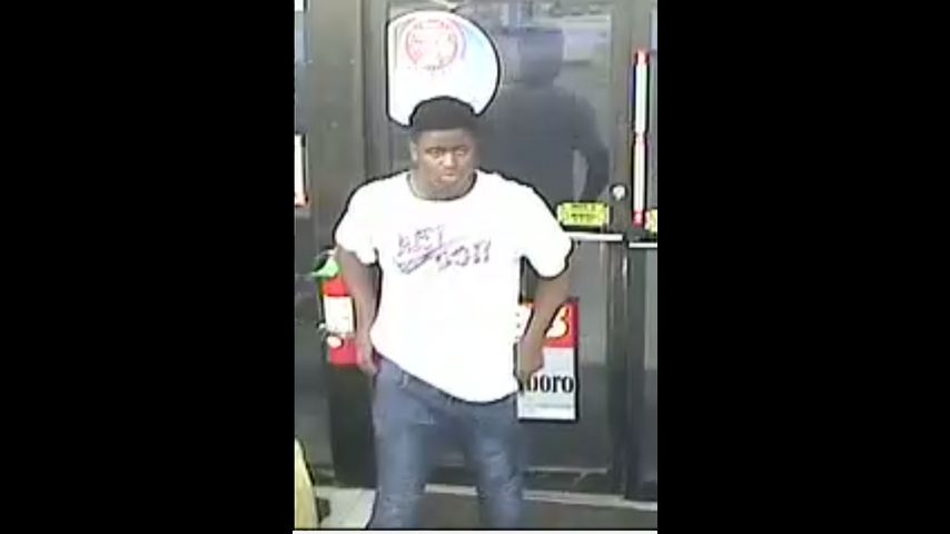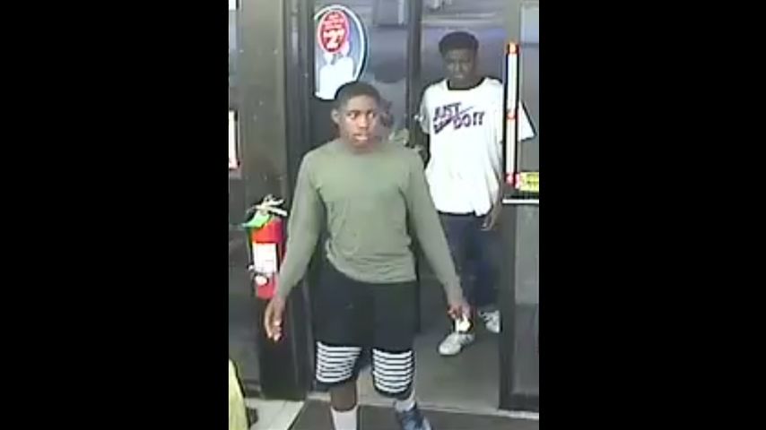 The first suspect is described as a black male wearing a white shirt with blue jeans. Suspect two is described as a black male wearing a green long sleeved shirt and black and white shorts.