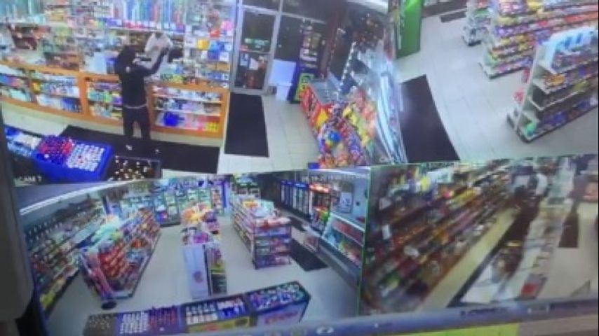 Surveillance video shows the gunfire exchange and bullets shattering a crock pot of nacho cheese. That's when you see the shots hit the suspect and he falls to the ground.