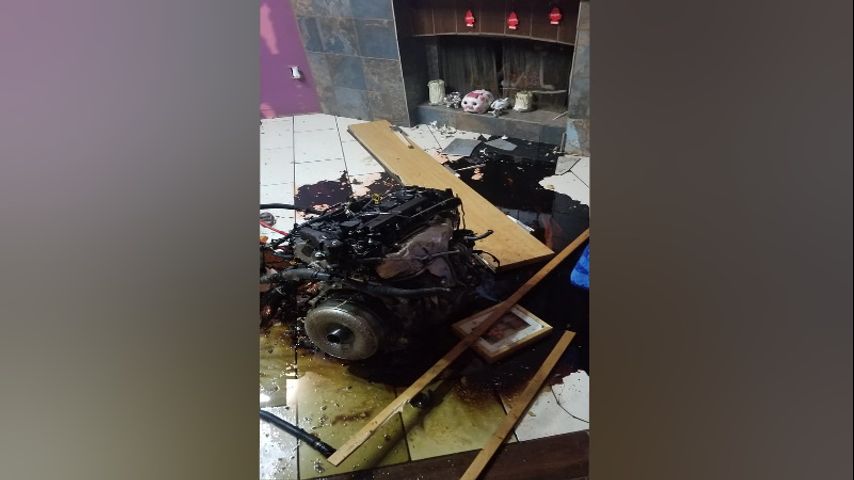 Emergency crews confirmed that the Jaguar's motor was also ejected from the vehicle and flew through the front door of a nearby apartment, sending two people inside to a hospital with non-life-threatening injuries.