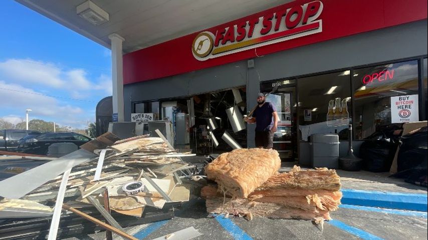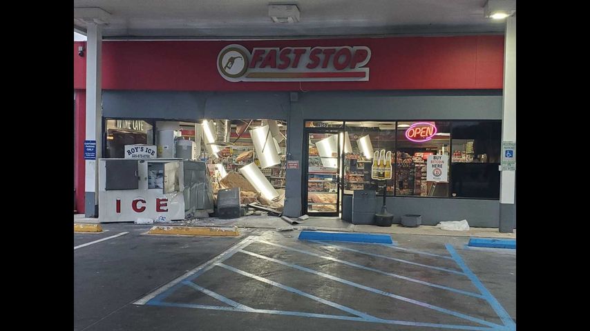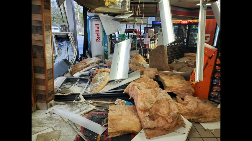 Photos show the wall of the gas station's convenience store torn down and significant damage inside, with fluorescent lights and insulation dangling from the ceiling.