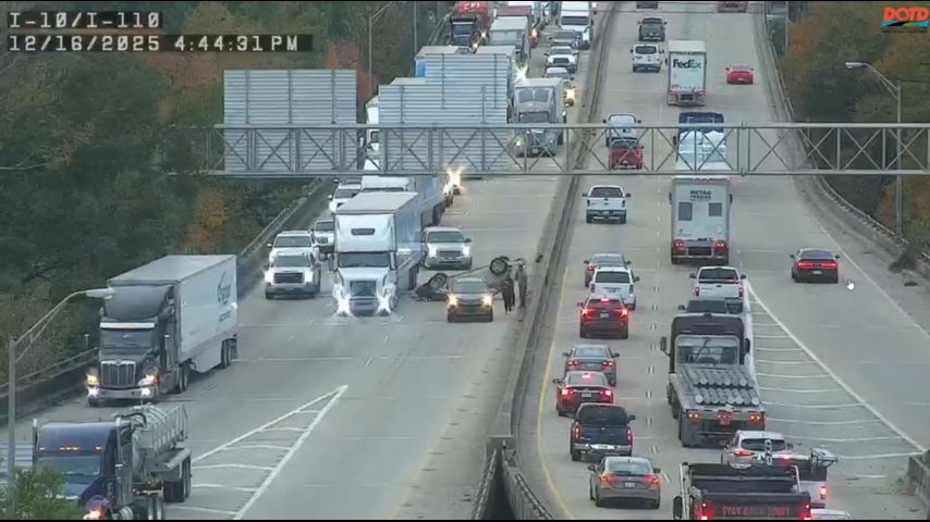TEAM 2 TRAFFIC: Two lanes blocked by overturned vehicle on I-10 East at I-10/I-110 split