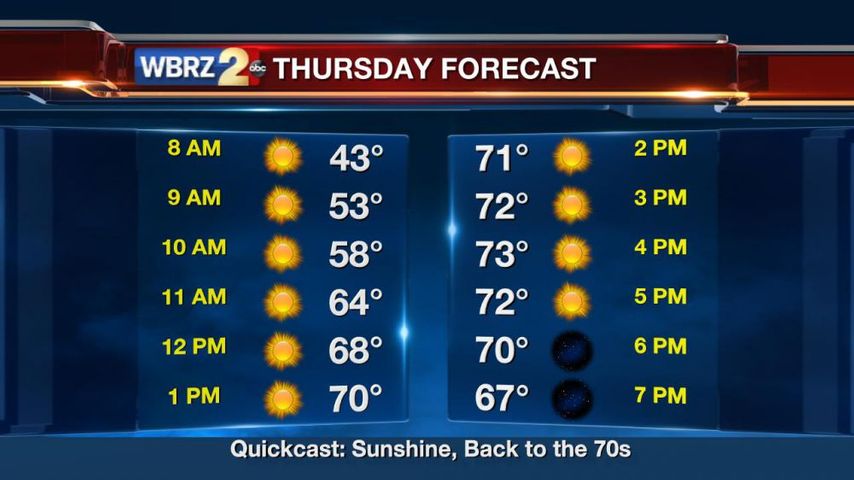 Up Next: Return flow will kick in on Friday, meaning winds will become southeasterly. That will allow temperatures to warm well into the upper 70s as sunshine continues across the region. There have been some chilly opening day games played at Alex Box Stadium, but not this time. The LSU Baseball season will begin against Cincinnati Friday Evening at 7pm beneath clear skies with a temperature falling through the upper 60s. Both weekend days will have foggy mornings and partly sunny afternoons with highs in the upper 70s and lows in the mid 50s.