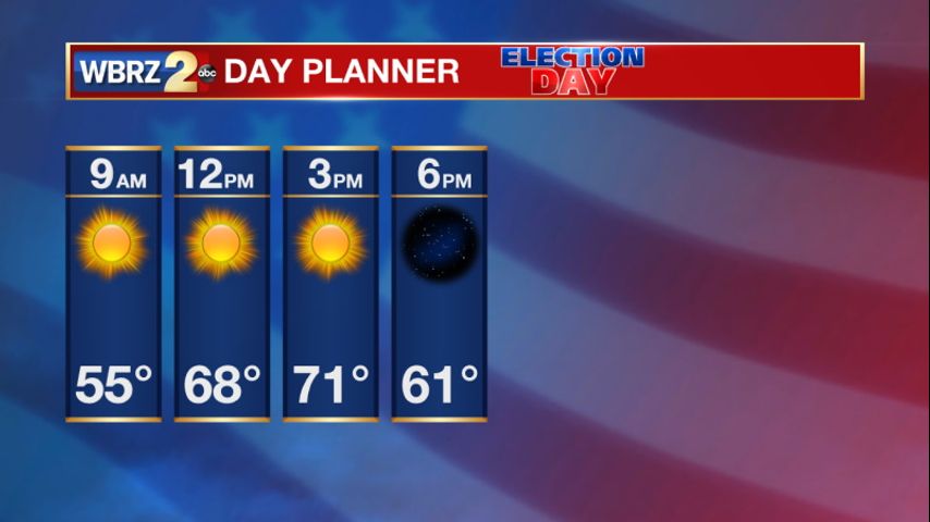 Today and Tonight: Temperatures will remain in the 50s through the late morning. Keep that in mind if you are heading to the polls before work today. This afternoon, temperatures will warm into the upper 60s and low 70s. Now with the time change, the warmest hour of the day is around 3 pm, then things will start to cool again. Temperatures will be back down in the low 60s and upper 50s in the late afternoon and early evening. Odds are, if you are standing around outside today, you may need a jacket. Skies will stay clear all day. Overnight, lows will be in the mid-40s.