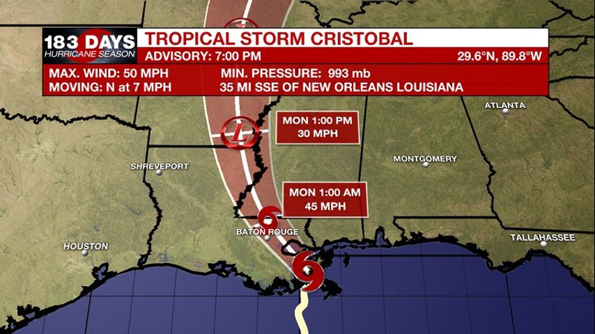 4AM MONDAY: Cristobal is now classified as a Tropical Depression and made landfall just east of Grand Isle around 5:10 PM on Sunday. The center of circulation is now making a northwest movement around 10 mph and will continue to weaken through the day. Associated winds are now 35mph.