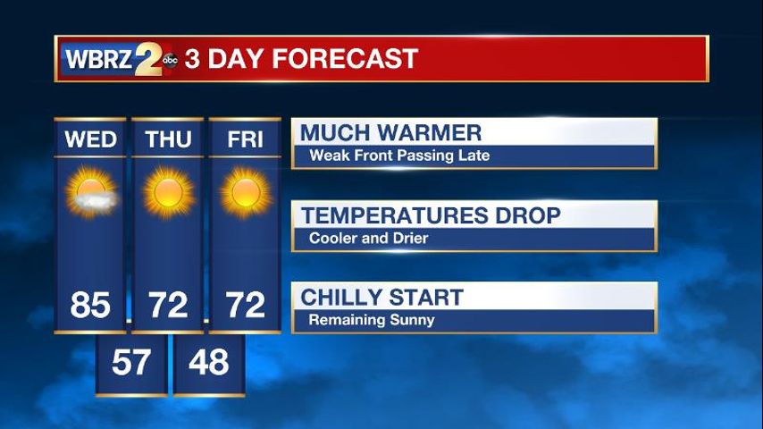 Today and Tonight: Wednesday will bring similar temperatures to Tuesday with highs making it into the low 80s. Winds will be southerly at 5-10mph. A few clouds may develop in the afternoon in advance of an overnight front but mainly sunny skies are still anticipated. Speaking of that front, it is most likely to pass by dry with little more than a patch of clouds into Thursday morning with lows near 60 degrees.