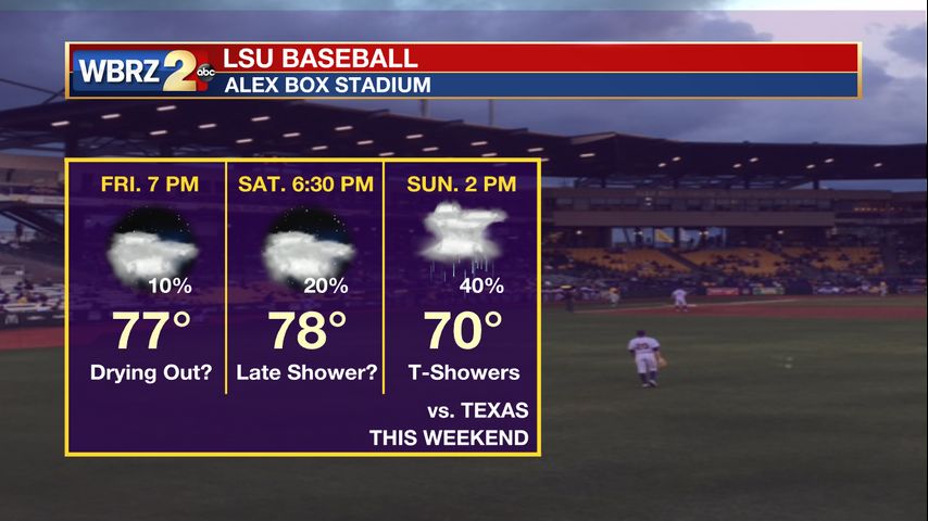 Expect a slightly better chance of showers and thunderstorms this afternoon with warm temps back in the 80s. Temperatures will likely be near 82 degrees. Overnight, expect some cloudy skies with lows near 68. Baseball is looking good for tonight deep in the heart of the bayou.