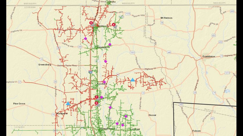 Damage reports came in from elsewhere along and north of Interstate 12, including near East Feliciana High School on the east side of Jackson and in the town of Clinton. Power outage maps showed a broad swath of utility customers without service.