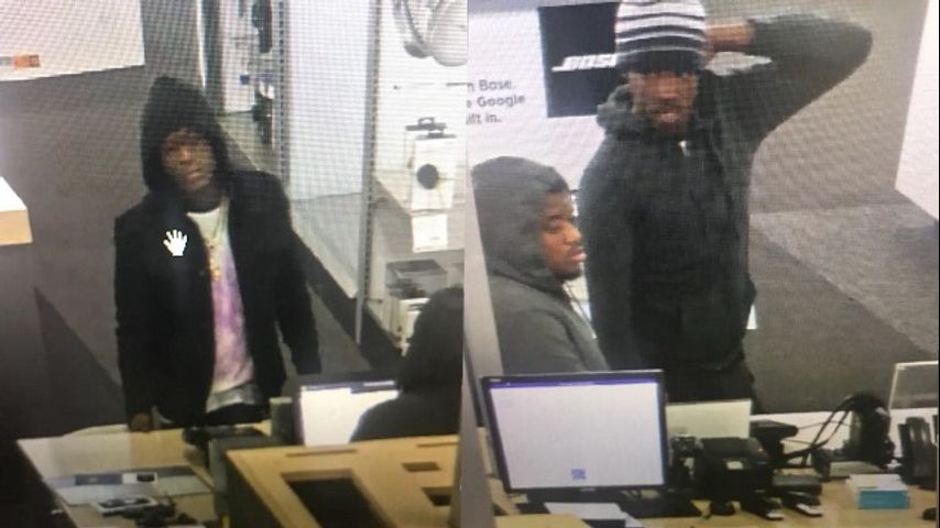 One man appears to be between 20 and 25 and wore a gray hooded sweatshirt with a white undershirt. The second appears to be between 18 and 25 and wore a black jacket and white undershirt. The third man appears to be between 18 and 25 and wore a dark gray hooded sweatshirt with a black and white striped beanie.