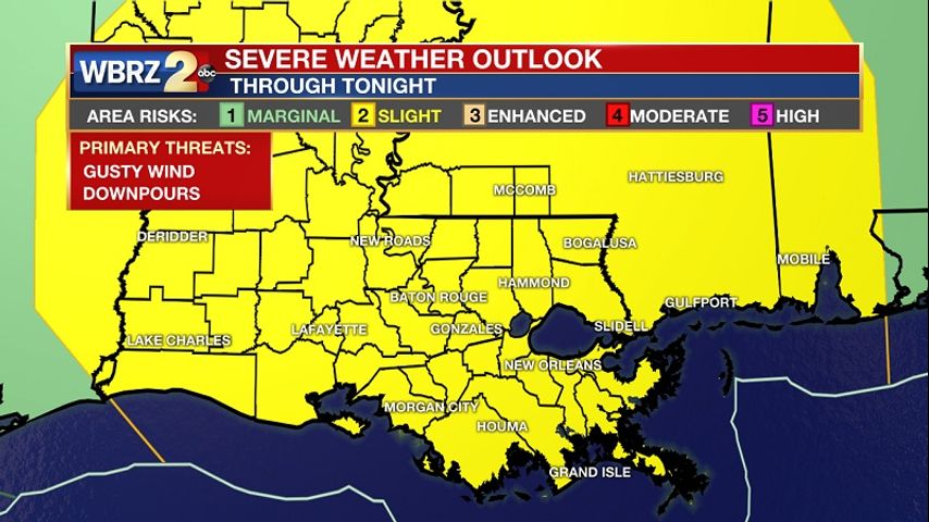 A cold front swinging down from the north this afternoon will bring showers and thunderstorms across the area. A few of these storms could be strong or even severe with gusty winds, heavy downpours, and frequent lightning. The Storm Prediction Center has placed all of south Louisiana and southwest Mississippi in a Slight Risk (Level 2 out of 5) for severe weather. This is what we would call a "standard risk". Still, it is nothing to ignore and it is important to stay weather aware as we head into the late afternoon and evening hours. For metro Baton Rouge, the main time frame will be between 1pm - 8pm. The entire line of storms will be out of the area by the overnight. Behind the front, a much cooler air mass will filter into the area just in time for the weekend. Highs will be in the mid 70s with lows in the mid 50s. Sunshine will be plentiful!