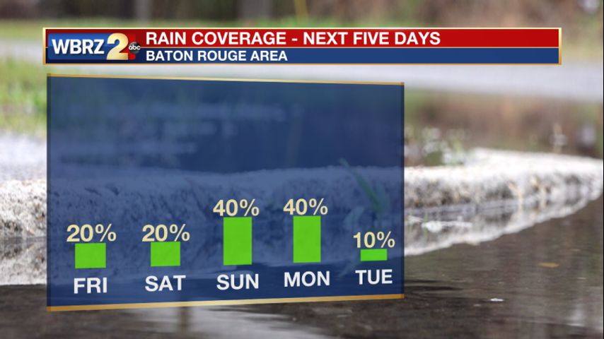 Up Next: Starting Friday, the rain coverage will be much less with just a few showers passing by. Temperatures will continue to trend in the mid-80s with high humidity. Saturday and Sunday will bring isolated to scattered showers in the afternoon. Saturday tailgates should prepare for a passing shower or two in the afternoon and evening. Weekend temperatures will be in the mid-80s. In the middle of next week, a front is forecast to move through the area. Showers and storms will spark up along it on Monday and parts of Tuesday. By Wednesday, dew points and rain coverage will show some significant drop. Click here to see the 7-day forecast.