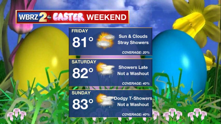 Up Next: The humidity makes a fast return on Friday with temperatures in the 80s and a few spotty showers possible in the afternoon. Overnight temperatures will be muggy in the mid-60s going into the weekend. Saturday will see a few showers late in the day, especially for areas north of Baton Rouge. If you have Saturday night plans, continue to check in with the Storm Station for the most updated timeline on Saturday rain. A few scattered thunderstorms will bubble up on Sunday afternoon. Not everyone will see rain but have an indoor Easter plan just in case. Any showers on Sunday will clear up by early Monday morning. A cooler and drier stretch will start early next week. Click here to see the 7-day forecast.