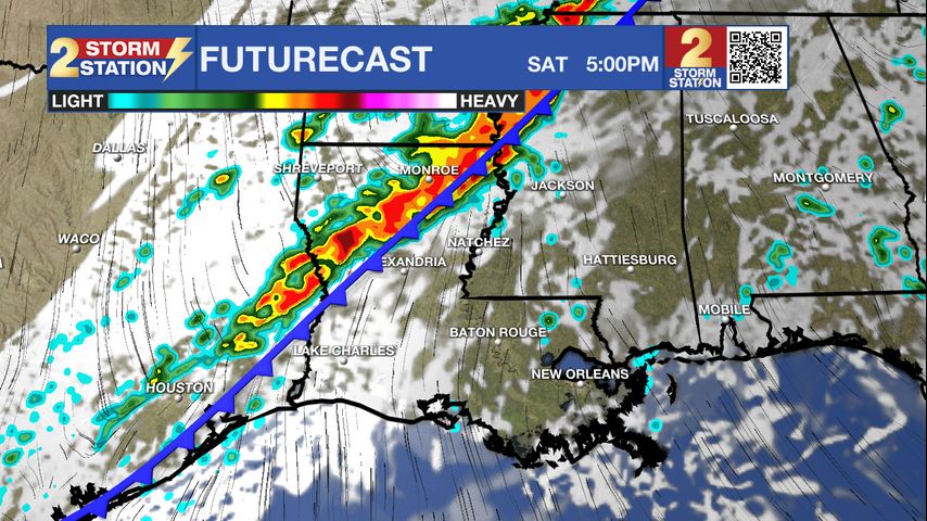 As of now, storm chances appear low for most of Saturday. However, you’ll need to monitor the forecast closely if you have any Saturday evening plans as there is a decent chance of showers and storms. A few storms might be on the stronger side too, but overall severe weather odds are low in the metro area. Severe weather chances are a touch higher in central and northern Louisiana where we find a Level 2/5 risk for severe weather. Baton Rouge is under a Level 1/5 risk for severe storms, an area where only spotty instances of damaging winds or hail are possible.