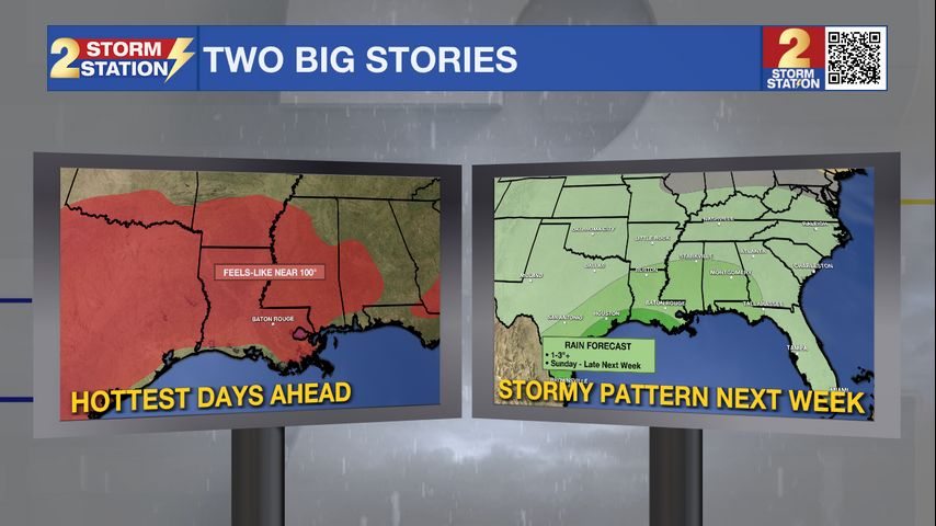 Next week: A weather system will approach Louisiana from the northwest late Sunday into Monday. With lots of moisture in the air, this system will help spark showers and thunderstorms through much of the upcoming week. Rain chances will be isolated around the Capital Area on Sunday, but become more scattered to widespread Monday through Wednesday. A few storms could be strong. Because of the clouds and rain, afternoon highs may drop slightly into the upper 80s next week—but it will still feel humid. Stay tuned for the latest updates.