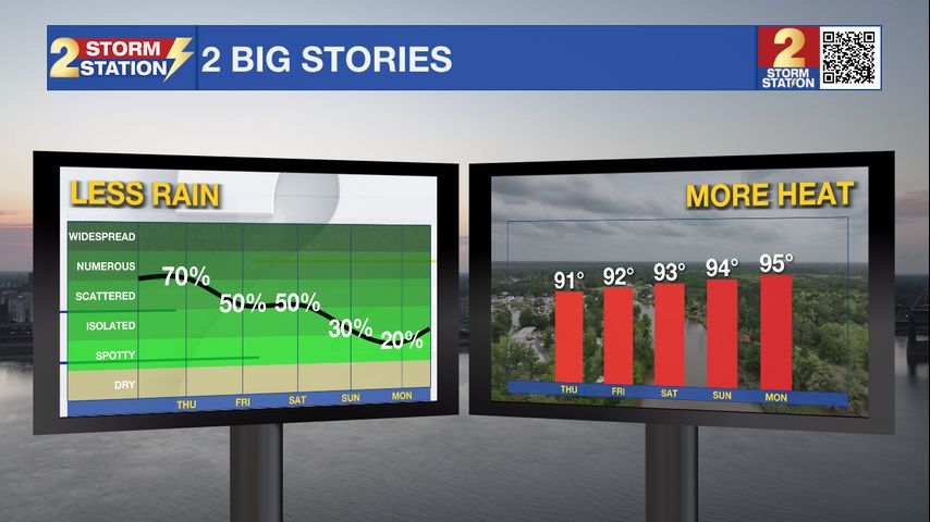 Up Next: We will slowly begin to transitions back to a typical summertime pattern over the weekend. Friday and Saturday feature a bit more sunshine with daily rain chances in the 50%, or scattered, coverage range. By Sunday, high pressure begins to move over the state, limiting rain to only isolated amounts during the afternoon. With less rain, temperatures each day will slowly begin to creep back up to near or above average for late July. Expect mornings in the upper-70s and afternoons in the low to mid-90's. Next week will feature hot days, much more sunshine, and afternoon pop-up storms.
