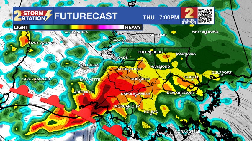 Today & Tonight: Thursday starts breezy and cool with clouds continuing to build and temperatures in the upper 40s across the state. Showers enter Louisiana this morning via the southwest corner and will make their way into SE Louisiana during the early morning hours. Temperatures this afternoon will be in the upper 60s. Isolated showers can be expected throughout the day and by the time you head home from work, some showers might be heavier in nature. Rain, and the breezy winds, with an occasional rumble of thunder and lightning will continue into the evening with the largest coverage occurring overnight tonight. Friday morning's commute could be a bit soggy as well, with possible spotty, strong thunderstorms with downpours and gusty winds.