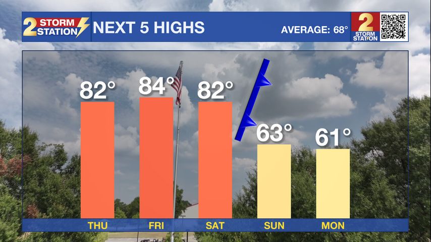 Up Next: Expect the warm stretch to continue, with showers possible as a cold front creeps toward the area. Isolated action will occur Friday, with a bit higher coverage Saturday as the front moves in. A few rumbles of thunder cannot be ruled out. Ahead of the front, temperatures stay on the warm side, with highs in the 80s both Friday and Saturday and overnight lows settling into the mid to upper 60s.