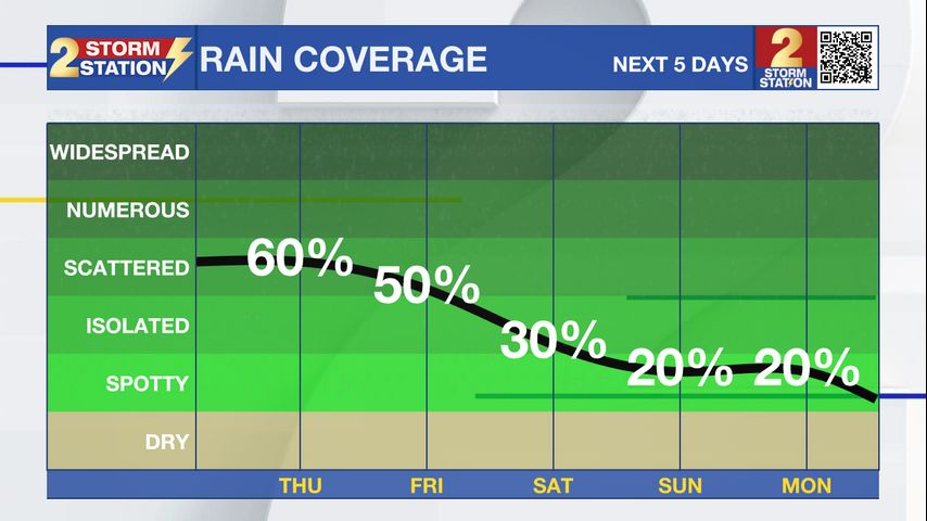 Relief from the heat each day may be closer than originally anticipated! A deep pocked of tropical moisture moves over the state to end the week, elevating rain coverage Thursday and Friday afternoons. The scattered showers may cool things down, but could also impact evening commutes and afterschool practices .