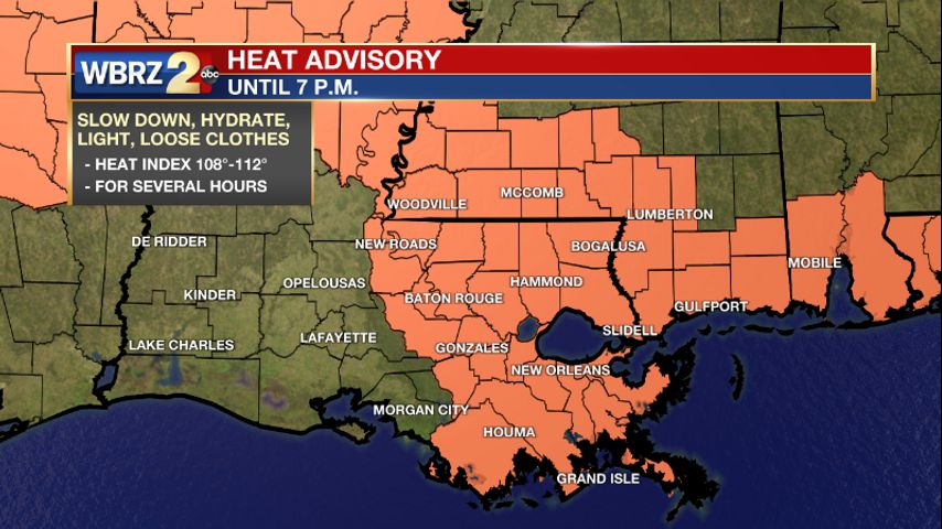 Today & Tonight: A Heat Advisory will be active from 10 a.m. to 7 p.m. today. The heat index will be between 108-112° this afternoon. Like yesterday, a few spots will get a shower or storm. Areas south of I-10 and I-12 will have a better chance to see some rain today. If you need to be outside today, take good care of yourself and drink lots of water. Temperatures tonight will not offer much relief, in the mid-70s.
