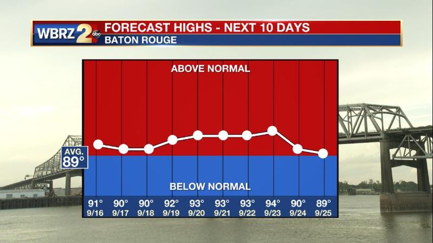 The Explanation: On Friday, a surface high will slide into New England having and therefore having less influence on the local weather. With this feature exiting and surface winds taking on an east to southeast direction, the front from earlier in the week will glide north toward the coast. Through Sunday, this boundary will activate a few showers and thunderstorms, primarily offshore. While some of them will drift west in the weak steering winds aloft, they will interact with continued dry air aloft which will make it hard for them to advance inland with any strength. Generally, chances for a shower or thunderstorm are in the 30 percent range along the coast trailing off to 10 percent around I-12 and near zero into Mississippi. Early next week, an upper level ridge of high pressure will slowly build eastward over the Midwest helping to diminish the old front. Our position on the southeast side of the ridge will cause drier continental air to flow into the area from the northeast. The twofold effects will be continued dry conditions but unseasonably warm temperatures. Average high temperatures for the third week of September are in the upper 80s but it looks like with the ridge centering over the Mid-Mississippi River Valley by next Thursday, most of the workweek will feature maximums about 5 degrees above normal. The drier air aloft will mix down tot eh surface keeping humidity from returning to August levels and low temperatures will be closer to average in the upper 60s and low 70s.