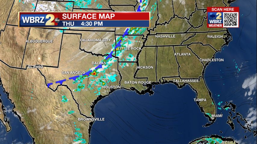 Tonight & Tomorrow: Clouds will increase overnight. With southeast winds of 10-15mph and increasing humidity, low temperatures will be propped up in the upper 60s. A weakening line of showers and thunderstorms will move into the area just after dawn Friday. Since this line is expected to be falling apart, some of the area may miss rain from this batch, especially north of Baton Rouge. Dry time and even a bit of sunshine will follow on Friday afternoon allowing high temperatures into the upper 70s and low 80s. As a cold front approaches Friday evening, a second line of showers and thunderstorms is anticipated. Opposite the early round, this action could skip areas south of Baton Rouge. In either batch, any thunderstorms could produce downpours and gusty wind, though widespread impacts are not expected.