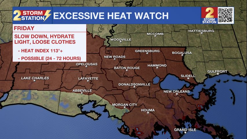 An *EXCESSIVE HEAT WATCH* has been issued all of southeast Louisiana on Friday. This means the heat could be even more extreme than what has been felt over the last few days. Heat index values over 113 degrees are possible. Hot temperatures and high humidity combined may cause heat illnesses to occur.
