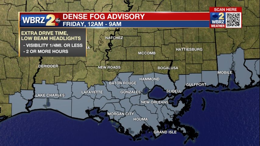 Tonight & Tomorrow: Initially, skies will be partly cloudy into the evening hours. Low temperatures will again stop near 70 degrees, challenging the previous record highest low of 68 degrees in 2018. With much lighter south winds of 5-10mph and dew point temperatures in the upper 60s, some fog will develop near the coast and settle inland. A *DENSE FOG ADVISORY* is in effect from 9pm tonight until 9am Friday along and south of I-12. Visibility OF one quarter mile or less in dense fog could cause hazardous driving conditions due to low visibility. Slow down, use low beam headlights, and leave plenty of distance ahead of you. Like much of the week, Friday will be mostly cloudy and warm. High temperatures are pegged for the middle 80s, and so records will be within reach again. The standing mark is 85 degrees set in 2022. There will be a dissipating cold front stalled between I-10 and I-20 which could try to spark a stray, afternoon shower.
