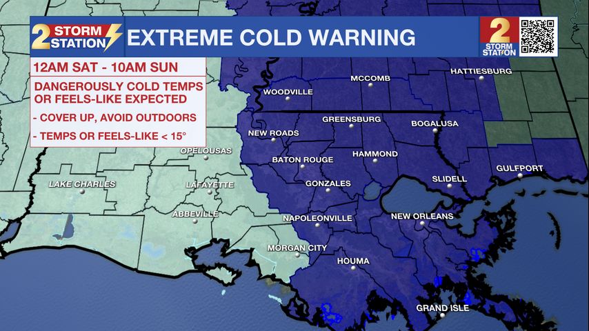 AM Sunday. Dangerously cold wind chills as low as 10 degrees are expected around southeast Louisiana. Frostbite and hypothermia will occur if unprotected skin is exposed to these temperatures. An extended period of freezing temperatures could cause ruptured water pipes. Dress in layers including a hat, face mask, and gloves if you must go outside. To prevent water pipes from freezing; wrap or drain or allow them to drip slowly. Keep pets indoors as much as possible.