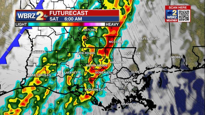 Up Next: A weakening cold front will approach the area overnight and into Saturday. A band of showers and embedded thunderstorms will move in on Saturday morning. The first hit of rain will come in the morning hours. Briefly gusty wind and downpours are possible as the line arrives. The front will be stalling and falling apart over the area, so a period of light to moderate rain will continue through the morning hours before tapering from west to east during the afternoon. For those tailgating this weekend, expect some wet weather early. Heading into Tiger Stadium, most of the activity should be over with, but you should still take in a poncho in the event of a lingering shower. As far as thermometers go, Saturday will be muggy with morning lows near 70 degrees, afternoon highs in the mid 70s and evening temperatures retreating into the upper 60s. With the damp conditions and a breeze, you may need a windbreaker or light jacket. Sunday will be mostly cloudy and mild with high temperatures in the low 80s. CLICK HERE for your detailed 7-Day Forecast.