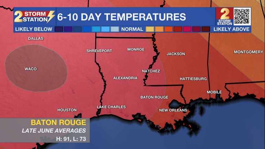 Up Next: Saturday will be the transitional day as far as weather is concerned. Temperatures will start to turn a little hotter as that weak front drifts farther north of the area. Isolated showers and thunderstorms will remain a possibility. By Sunday, and then into next week, an upper level ridge of high pressure will build over the Gulf Coast. This common feature tends to bounce back and forth across the southern United States during the summer. When overhead, we get stretches of very hot temperatures and minimal rain coverage. Next week, look for a return to highs in the upper 90s and lows in the upper 70s. Once again, we may need advisories or warnings for the heat.