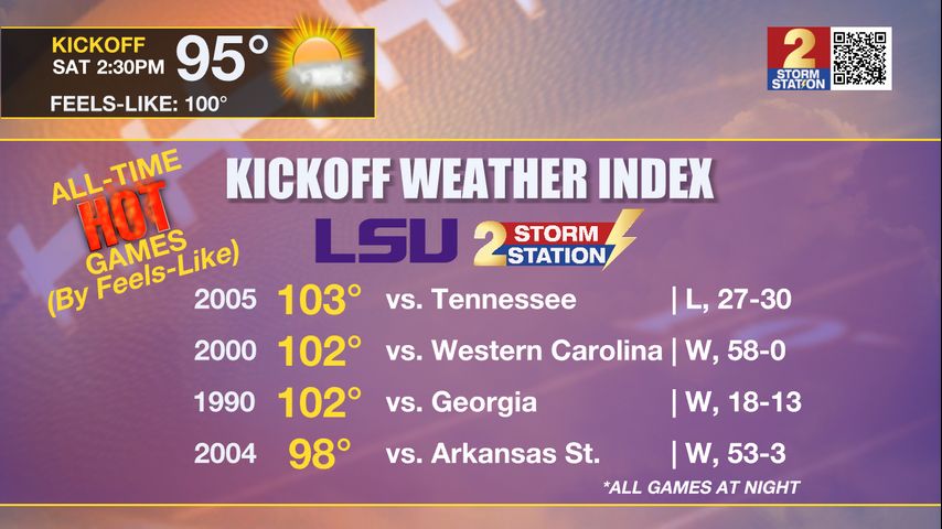 Up Next: Through the weekend, skies will be mainly clear and temperatures will stay hot with highs in the mid 90s and lows in the low 70s. According to the LSU Kickoff Weather Index, a feels-like temperature near 100 degrees at game time will make this one of the top three hottest on record in Tiger Stadium. The last game this hot, and likely the hottest on record, came against Tennessee in 2005 as the teams kicked off to a heat index of 103 degrees. Into next week, there are a number of factors that will play into the forecast including a weak front approaching from the northwest and the possibility of a tropical system in the southeastern Gulf of Mexico. Any added impacts such as rain or a cold front passage will likely not be in play until Wednesday or Thursday.