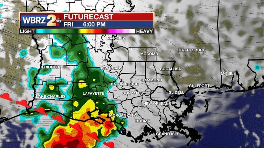 The Explanation: An upper level trough of low pressure over the Mountain West will move eastward on Friday causing the jet stream to come out of the southwest and increase moisture over the local area. Expect an increase in high clouds early in the day and that deck will lower and thicken into the afternoon. Since onshore winds will not strengthen until afternoon, the atmosphere will not be saturated enough for light rain to develop until later in the day. The upper level trough will then track out of Texas into Louisiana Friday night into Saturday. The associated surface low will move from southeast Texas across the I-10/12 corridor during that same time period. Moisture will surge well above average as this occurs, supporting scattered to widespread precipitation. The question is exactly how far inland will warmer surface air surge and therefore allow thunderstorms? At this time, it looks as though the most unstable air will remain near the coast resulting in only some rumbles of thunder in and around Baton Rouge. However, any northward jog in that instability could open the door for one or two strong thunderstorms on Saturday morning. Drier air will push in by Saturday afternoon ending precipitation from west to east. A few low level clouds may linger Saturday night into Sunday. For Halloween and early next week, a weak surface high pressure system in the region will dictate quiet weather with near average temperatures. A weak system well to our south could throw a shower or two inland Tuesday night or Wednesday morning.