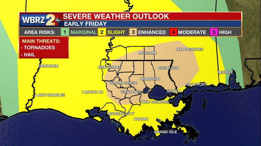 NEW: Just after 8pm on Thursday, the National Weather Service Storm Prediction Center upgraded much of the WBRZ Weather Forecast Area to a 3/5 "enhanced risk" for severe weather. This is due to increasing confidence in the potential for storms to produce tornadoes in those areas.
