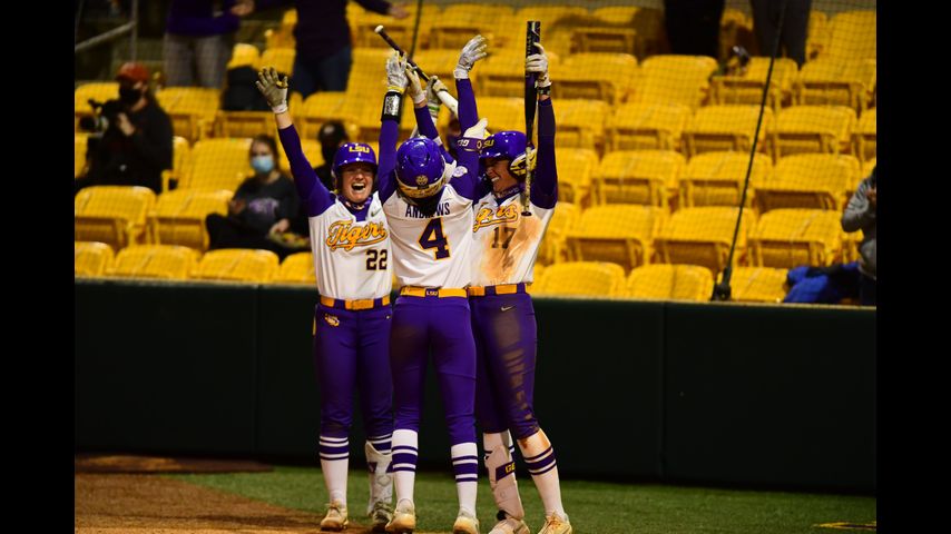 BATON ROUGE - After falling in game one, the No. 13/12 LSU Softball Team bounced back and claimed the final two games over No. 7 Texas on Saturday, claiming a 2-1 win in eight innings in game one and a 7-2 win in game two. The Tigers improve to 13-6 on the year, while Texas is now 10-2.
