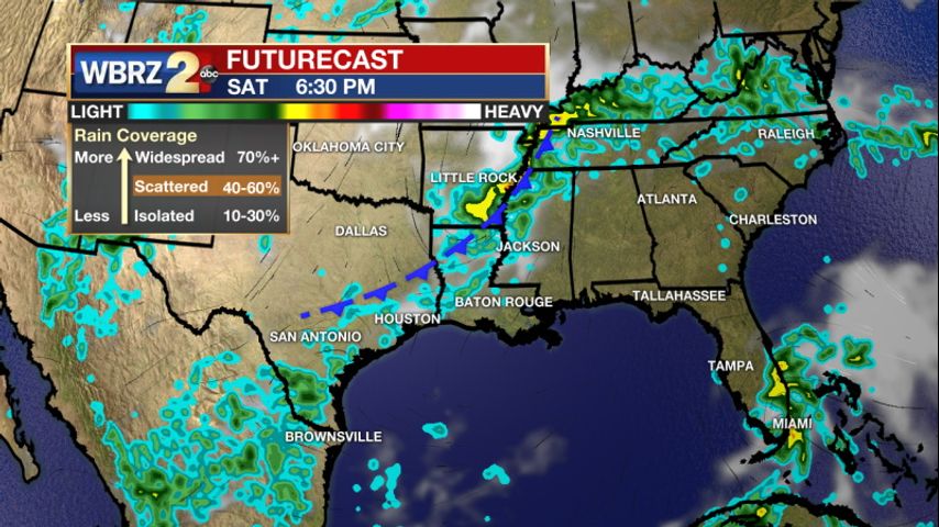 Up Next: Friday also looks dry with temperatures near 92. Rain will be back in the forecast for Saturday and Sunday as we expect a front to move through the area. Between 40-50% will be associated with a front moving through Saturday afternoon. That rain will linger into Sunday as well. High temperatures hovering right around 90 degrees and overnight lows in the mid 70s.