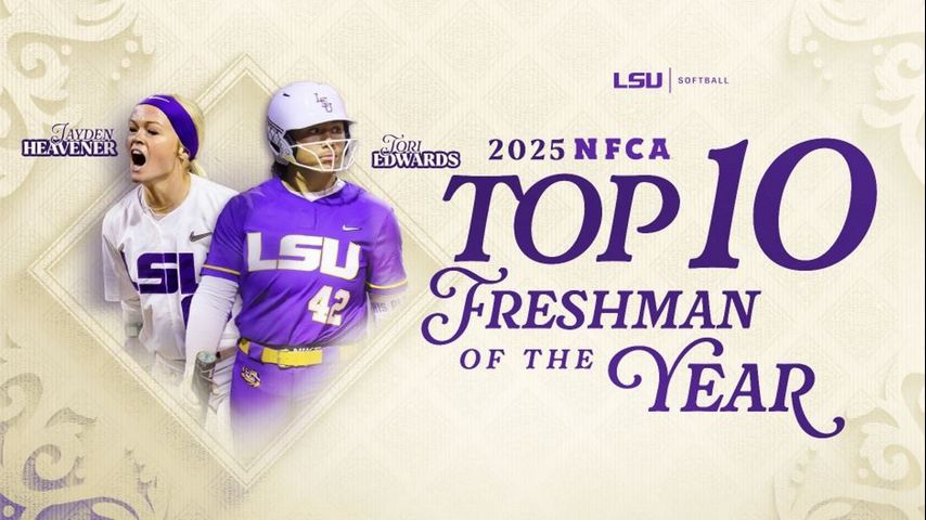LOUISVILLE, Ky. – LSU softball stars Tori Edwards and Jayden Heavener were announced as top 10 finalists for the 2025 NFCA Division I National Freshman of the Year award on Thursday.