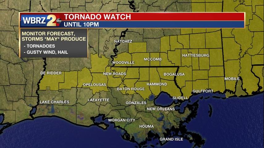 A TORNADO WATCH has been issued for parishes and counties north of I-10 until 10pm tonight. A TORNADO WATCH means conditions are favorable for tornadoes and/or damaging winds in and around the watch area. Be on the lookout for threatening weather conditions and listen for later statements and possible warnings. If a tornado warning is issued, seek shelter in a low-level, interior room of a sturdy building. Take pets (on a leash) with you, have on hard-soled shoes, monitor storm coverage on a wireless device and cover your head in the event of wind or tornado impact. For more on tornado safety, CLICK HERE.