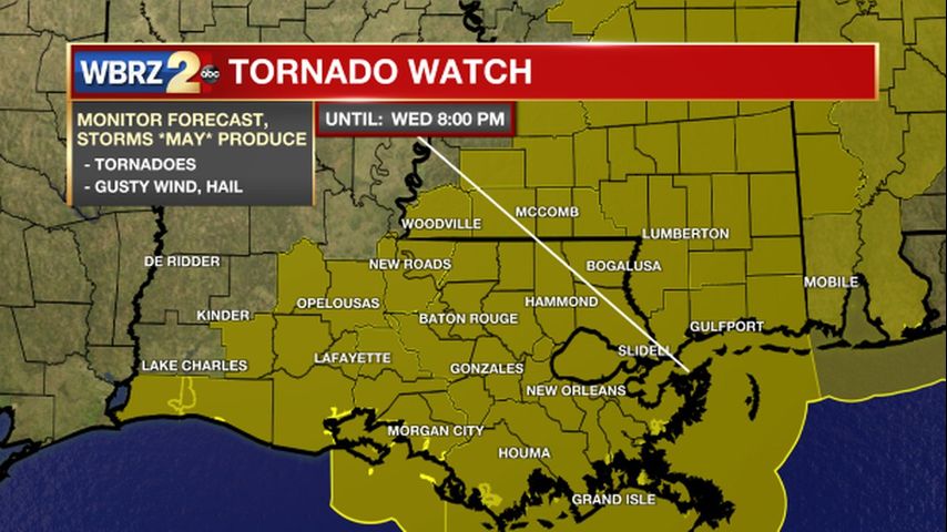 A Tornado Watch remains in effect for the entire WBRZ viewing area through 8 p.m. Wednesday.