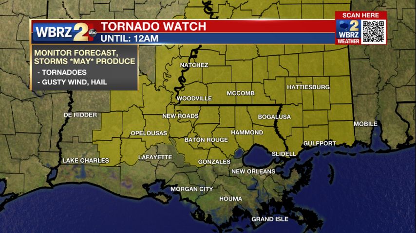The National Weather Service has issued a TORNADO WATCH for East Baton Rouge, West Baton Rouge, Ascension, Iberville, East Feliciana, Livingston, Pointe Coupee, St. Helena, Tangipahoa and West Feliciana Parishes as well as, Amite, Pike and Wilkinson Counties until 12am Thursday.