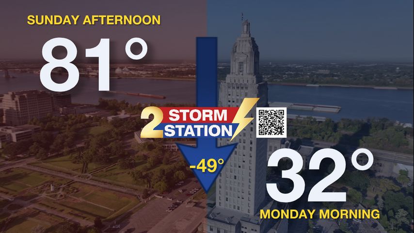 Rest of Tonight: Rain will quickly come to an end behind a strong cold front. Now, the primary focus is shifting to cold weather. Temperatures will rapidly fall overnight, with morning lows near freezing in Baton Rouge. Rural communities surrounding Baton Rouge and areas north of the interstate could dip into the upper-20s.