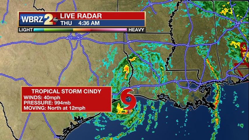 Tropical Storm Cindy: Tropical Storm Cindy continues to weaken and move toward a landfall. This storm was a textbook example though of impacts occurring well away from that National Hurricane Center forecast cone. Heavy rain, flash flooding and tornadoes battered coastal Mississippi east to the Florida panhandle—the worst just missing Southeast Louisiana. As of 4am Thursday, Tropical Storm Cindy was located about 30 miles west, southwest of Lake Charles, Louisiana with maximum winds of 40mph, a minimum central pressure of 994mb and was moving north at 12mph. Tropical rain bands will continue to affect the local area and where these features take shape, some heavy amounts remain possible. Persistent bands could easily produce up to 3 inches and flash flooding. While winds are shifting southerly and easing, lakeshore flooding will only stop increasing and shift easterly. Slow receding of water will occur via drainage over the next 48 hours. Low level rotation in the atmosphere is increasing as Tropical Storm Cindy approaches land and therefore tornadoes will be a concern for Wednesday—especially south of I-10.