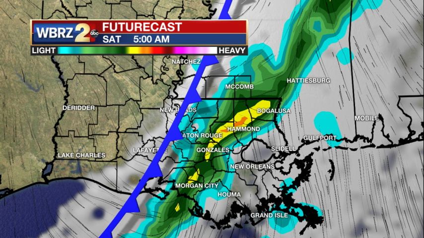 Up Next: Friday is looking mostly dry until a front starts to spark up rain in the very late evening hours. That rain will move west to east over south Louisiana overnight into the morning hours of Saturday. Right now, the timing of the front is showing most of the rain clearing up by the late morning on Saturday. The rest of the day will be clear of showers (see Futurecast snapshot below), but some clouds will linger with temperatures in the low 70s. A few showers will be possible on Sunday afternoon as well with high temperatures dropping into the 50s. Click here to see the 7-day forecast.