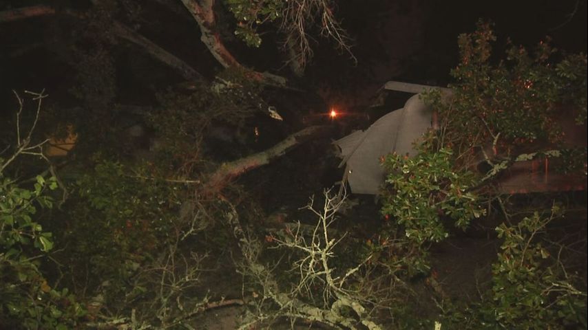 Tree falls on vehicles, causes gas leak