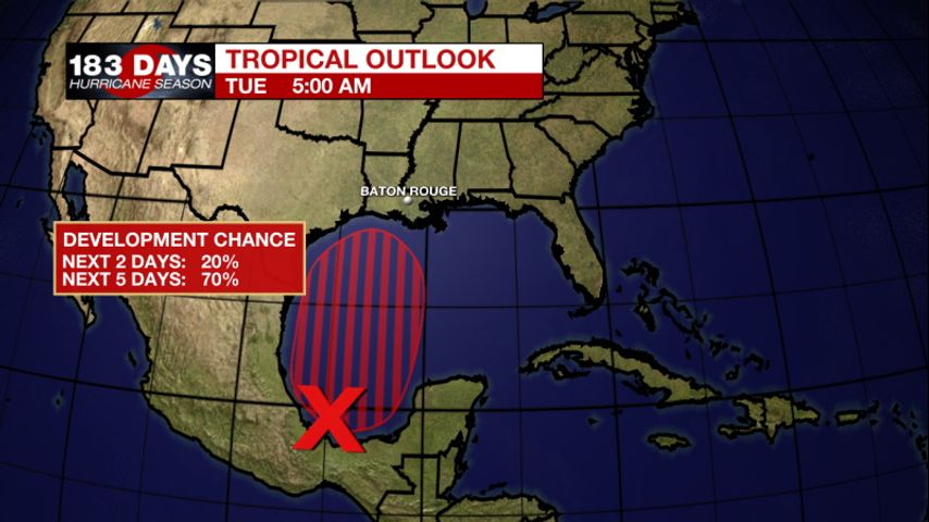Mid to late week the disturbance in the southern Gulf will likely become more organized. It has about a 70% chance of developing into a tropical depression in the next 5 days. Regardless of development, it is already a rain maker. Parts of Mexico will be dealing with tropical showers and storms for the first half of the week until the disturbance starts to track north. After the circulation becomes more organized, the forecast will become clearer. That likely won’t happen until Wednesday or Thursday at the earliest. Click here to visit the WBRZ Hurricane Center.